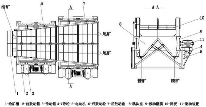 跳汰机是现代重选设备之一。由于其处理能力大,选别粒度范围广,维护简单,作为粗选或精选,被广泛用于选别金、钨、锡、 铁、锰、钛等矿物。2LTC6109-8T梯形跳汰机的隔膜垂直地安装在跳汰室筛板的侧壁上,按隔膜运动方向区分,与矿流运动方向垂直成为横向侧动隔膜 跳汰机。由于隔膜设置在槽体的外壁,又称侧动外隔膜跳汰机,按跳汰室水平面形状也称梯型跳汰机。