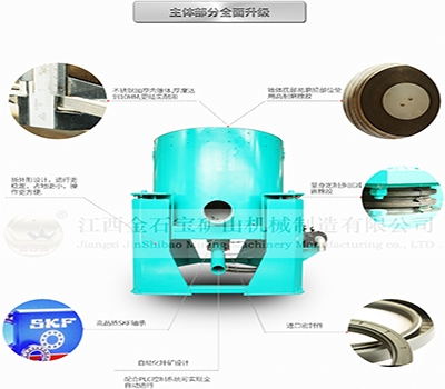 黄金分选机也称水套式离心机是专为金,银,锡,铅等贵金属设计的新型重选设备。该机主要是利用矿物的密度不同,在高速离心旋转的同时,施加反冲压力水,来达到分选矿物的目的。经实验证明,对金矿尤其显著。富集比可达1000倍。可以替代固定溜槽、螺旋溜槽、跳汰机等重选设备在流程中的作用。并有效的解决了传统溜槽微细金跑尾的问题。