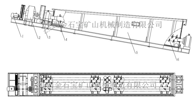 1.电机 2. 减速机 3. 齿轮 4. 传动轴 5. 槽体 6. 搅拌叶片