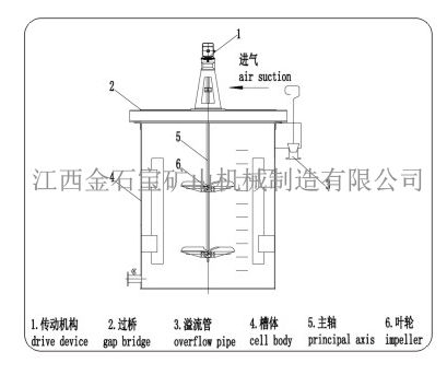 其工作原理:料浆在双叶轮的推动下,从中心自上而下流动,向周边的阻泥板扩散,从中空轴给入空气与料浆混合并向上循环促进气泡细化,形成悬浮混合液,浸出率高。