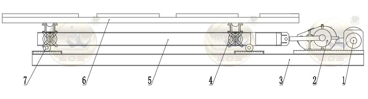 1、电机   2、减速机   3、底座   4、调坡机构  5、托架  6、床面  7、滑动机构