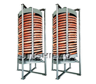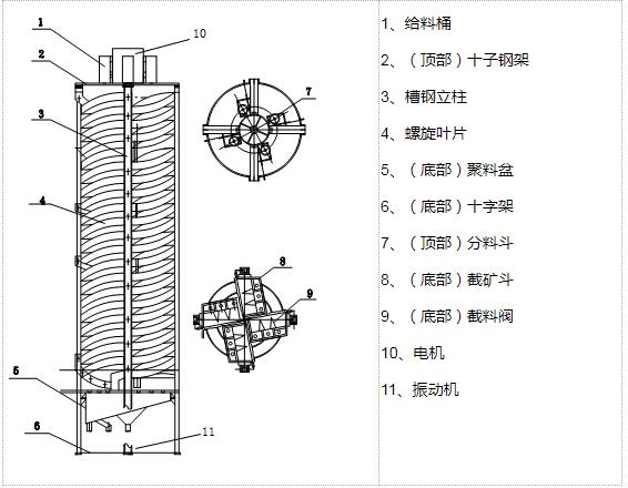 螺旋溜槽由分矿斗、给矿槽、螺旋槽,产品截取槽、接矿槽和槽钢支架(包括十字架或三角架)电机、振动电机等八